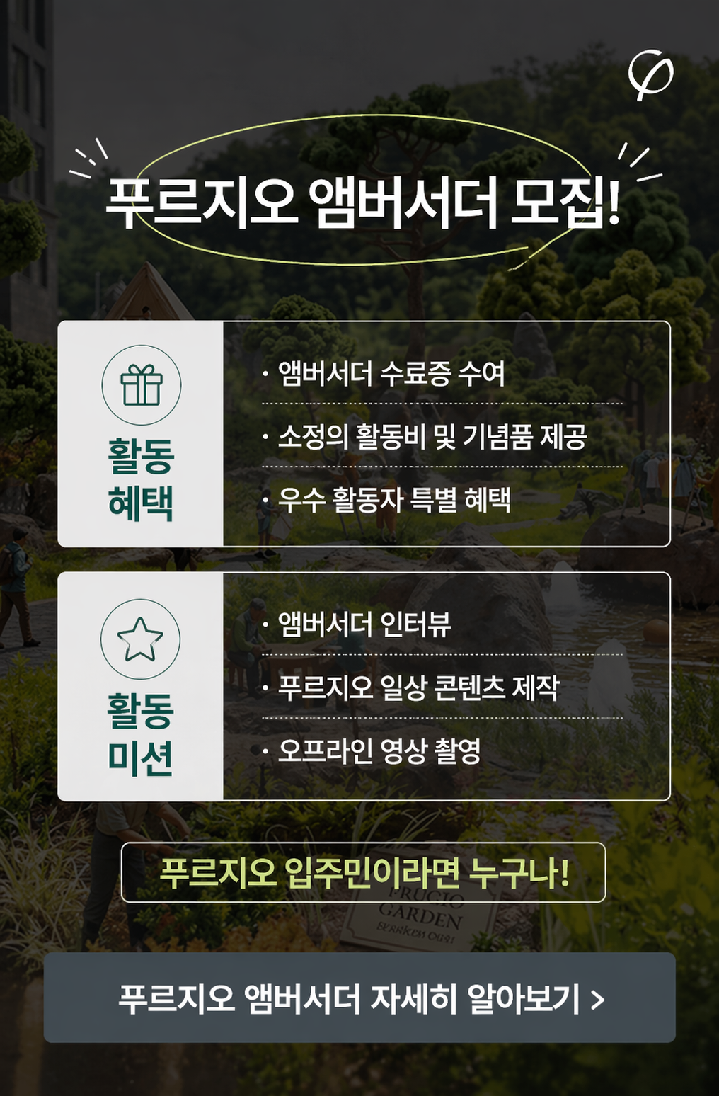 푸르지오는 여유, 행복, 그리고 경험을 가꾸는 생활을 차원이 다른 프리미엄으로 이야기합니다.