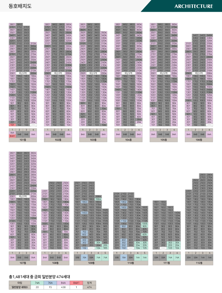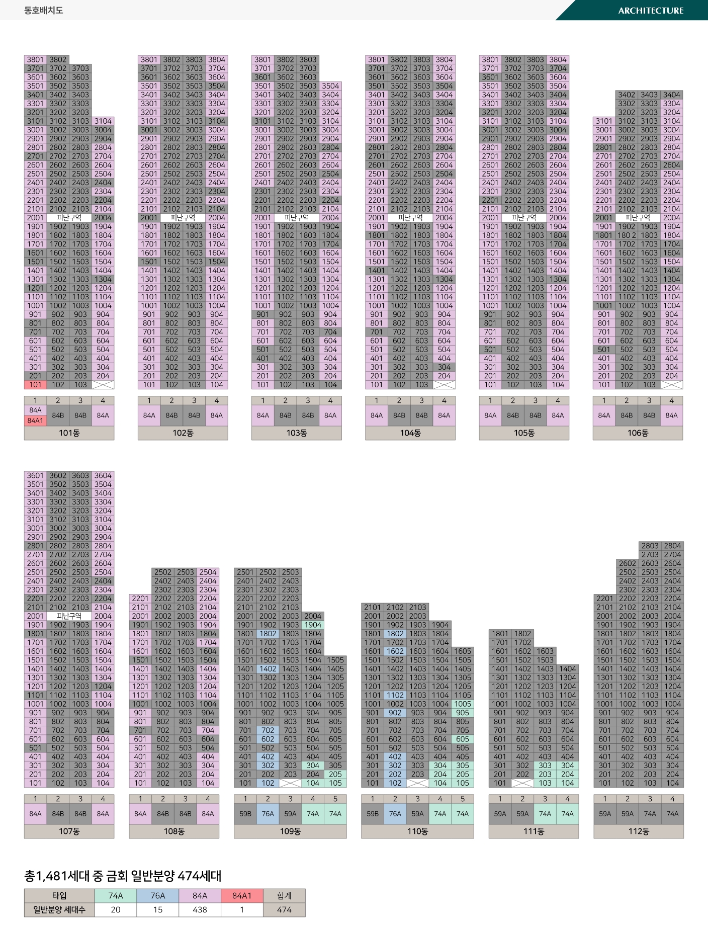 상기 동호수표는 전체동 중 일반분양 세대에 해당되는 동호수만 컬러로 표기한 것이며, 제작 과정상 오류가 있을 수 있으니, 반드시 견본주택에서 확인하시기 바랍니다.