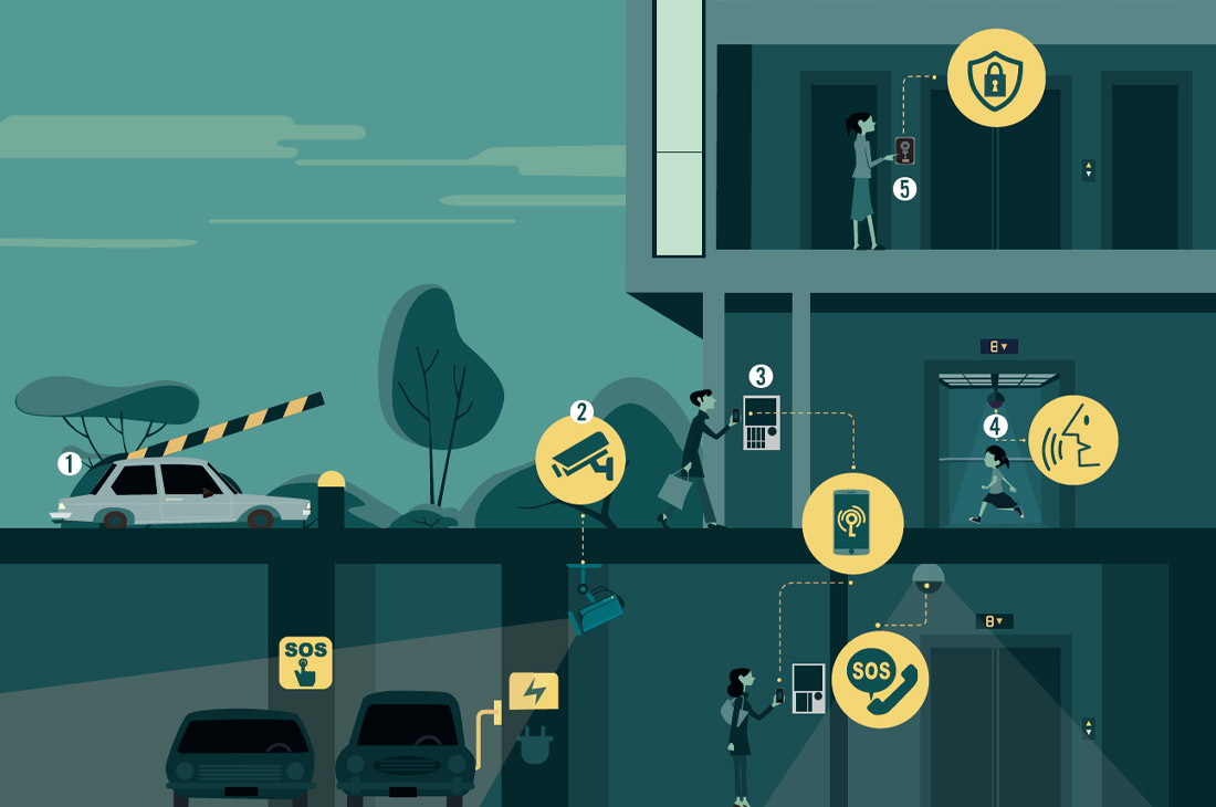 지하주차장에 미세먼지, CO(일산화탄소)를 감지하는 센서를설치하고 공기질에 따라 주차장 팬을 가동하여 자동차 매연 및미세먼지를 배출합니다.