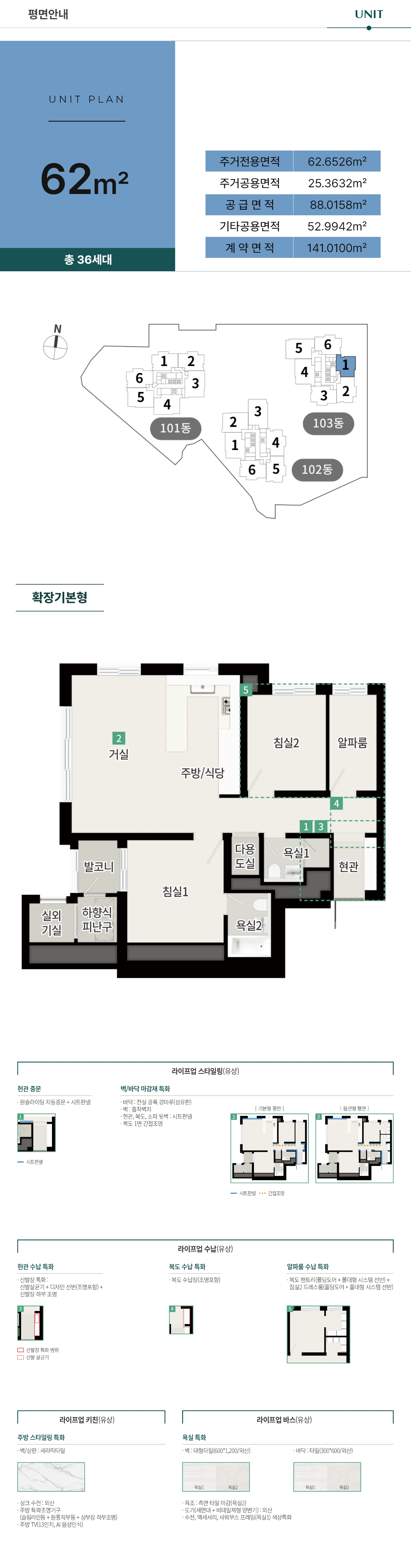- 세대 내부 가구(붙박이 가구, 주방가구) 설치 부위의 비노출면(바닥, 천장, 벽체)은 별도의 마감을 제공하지 않습니다.