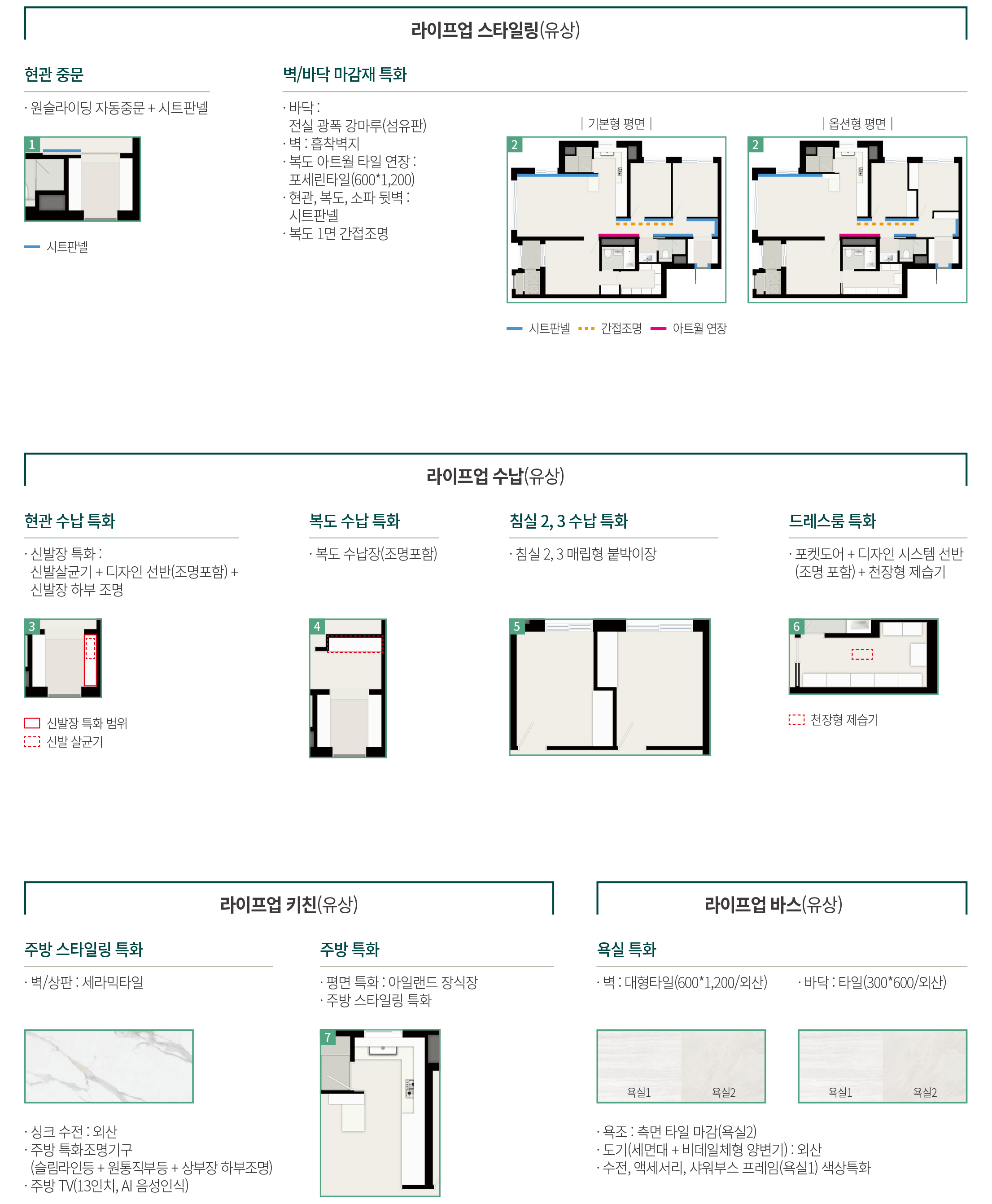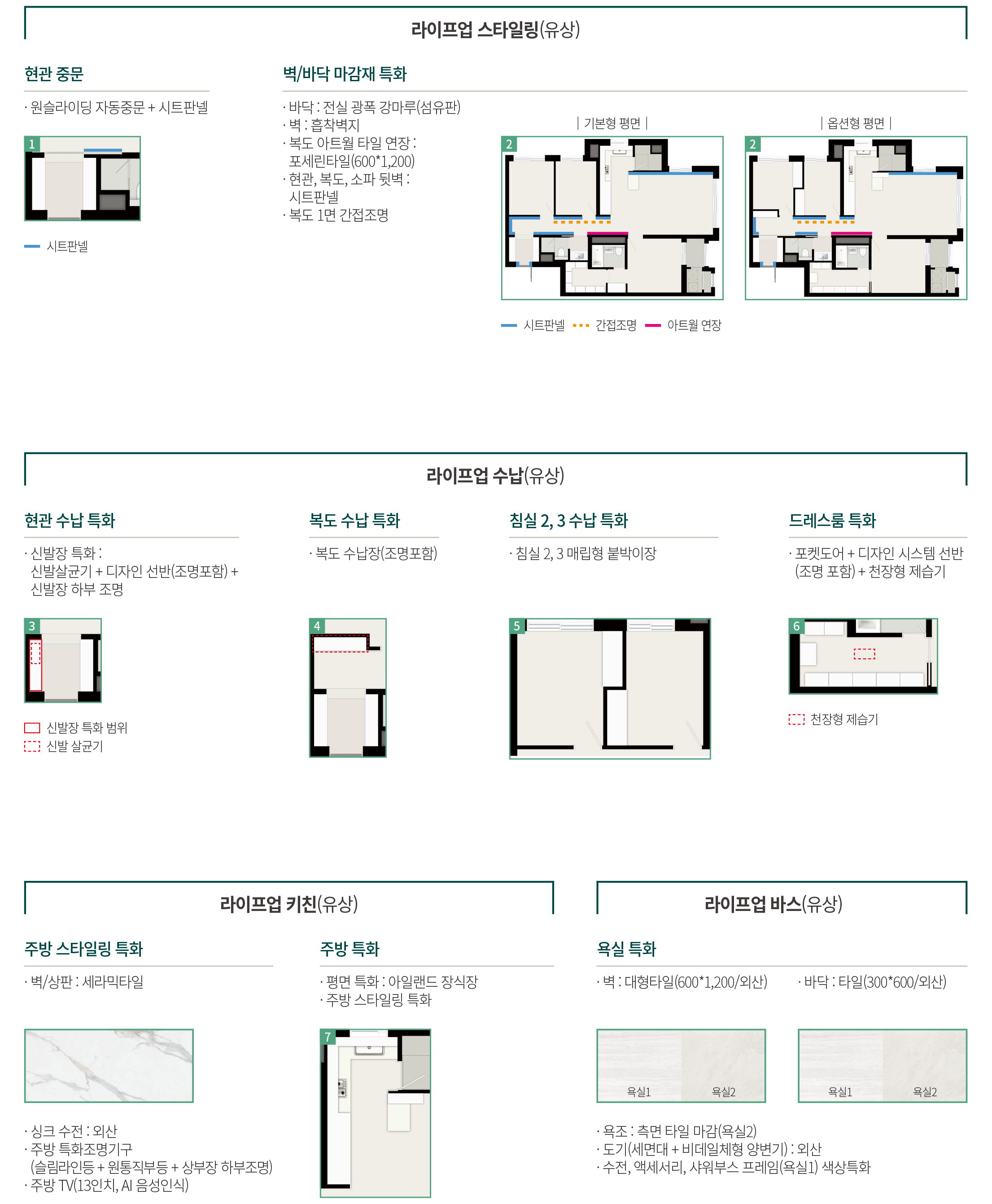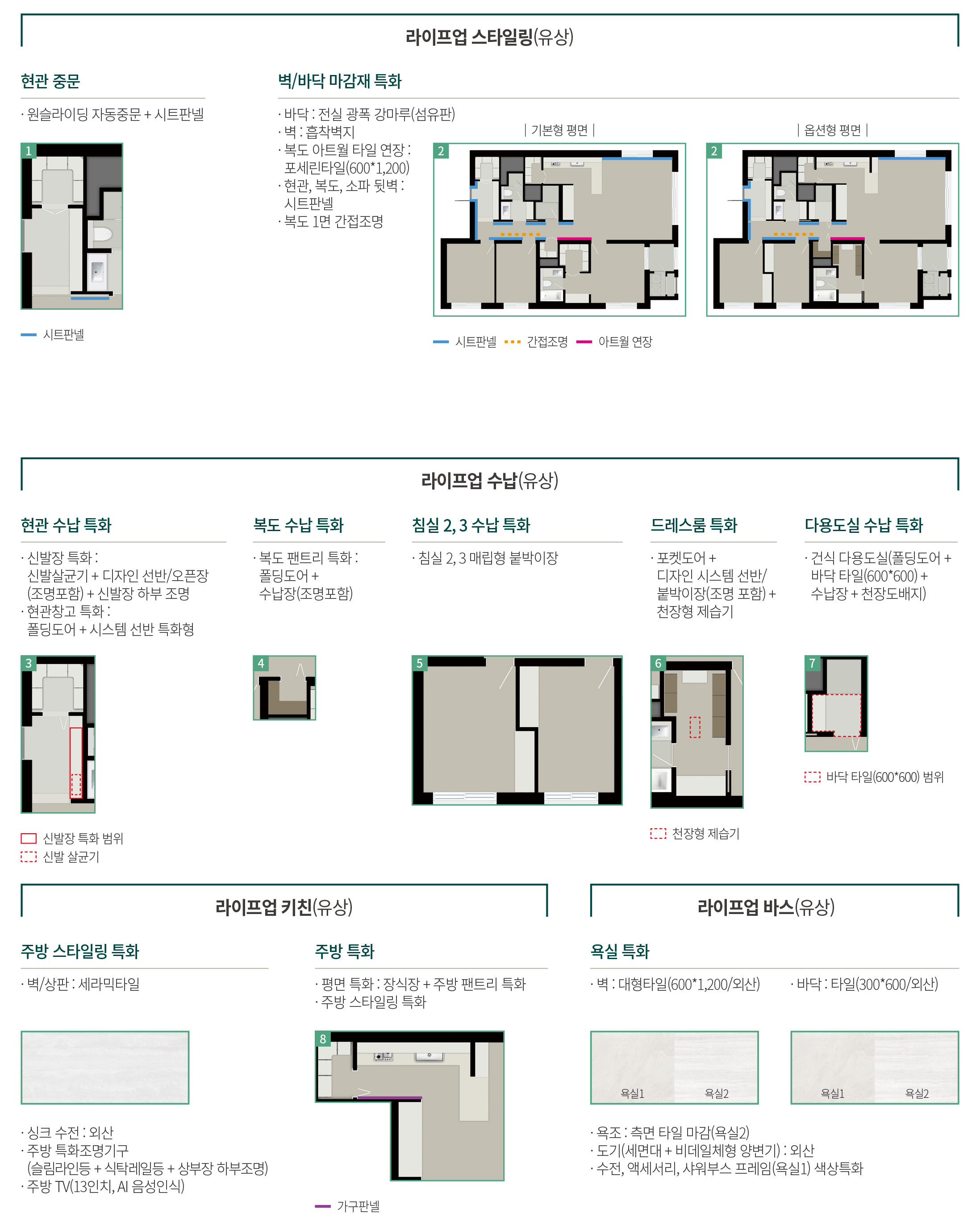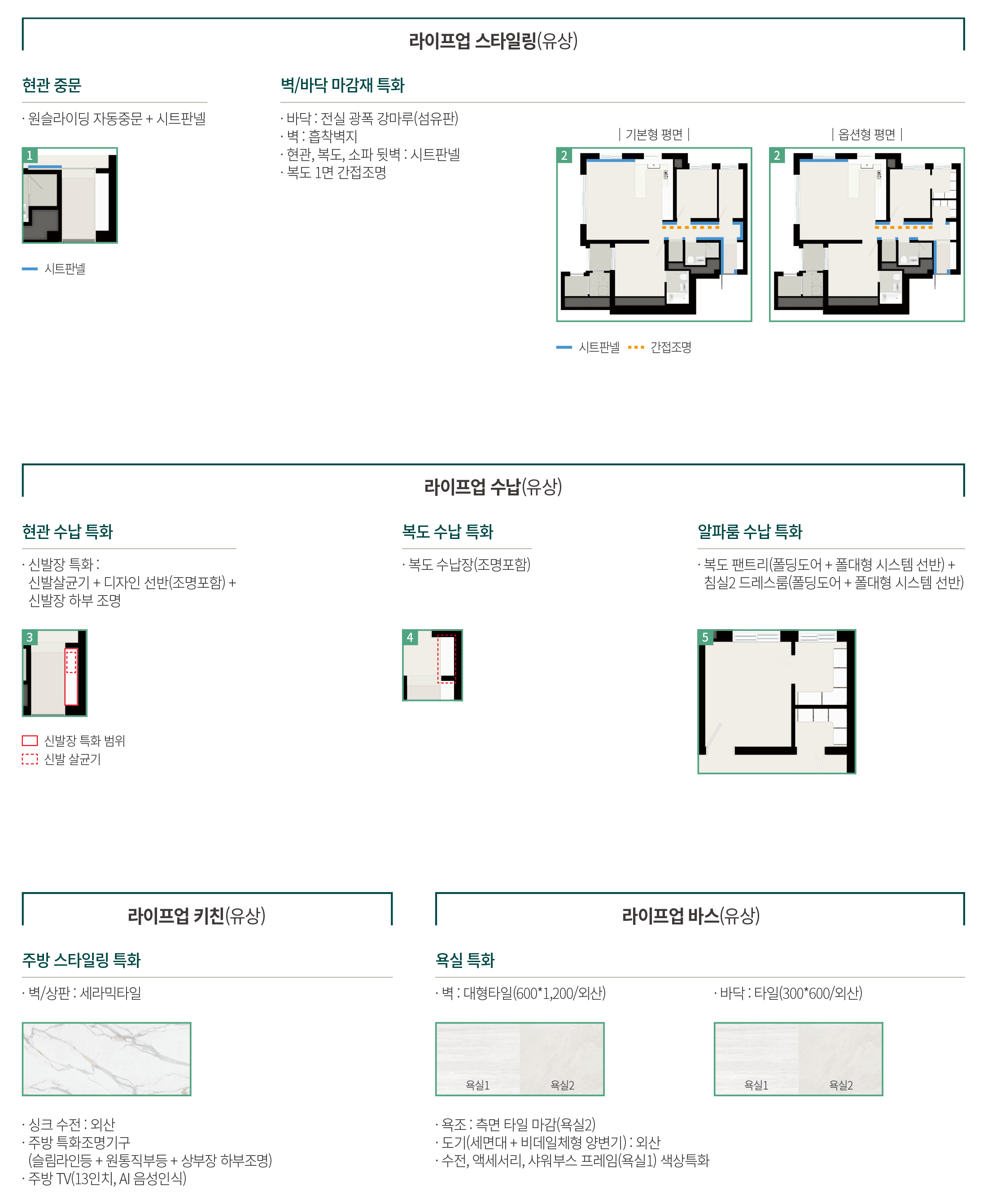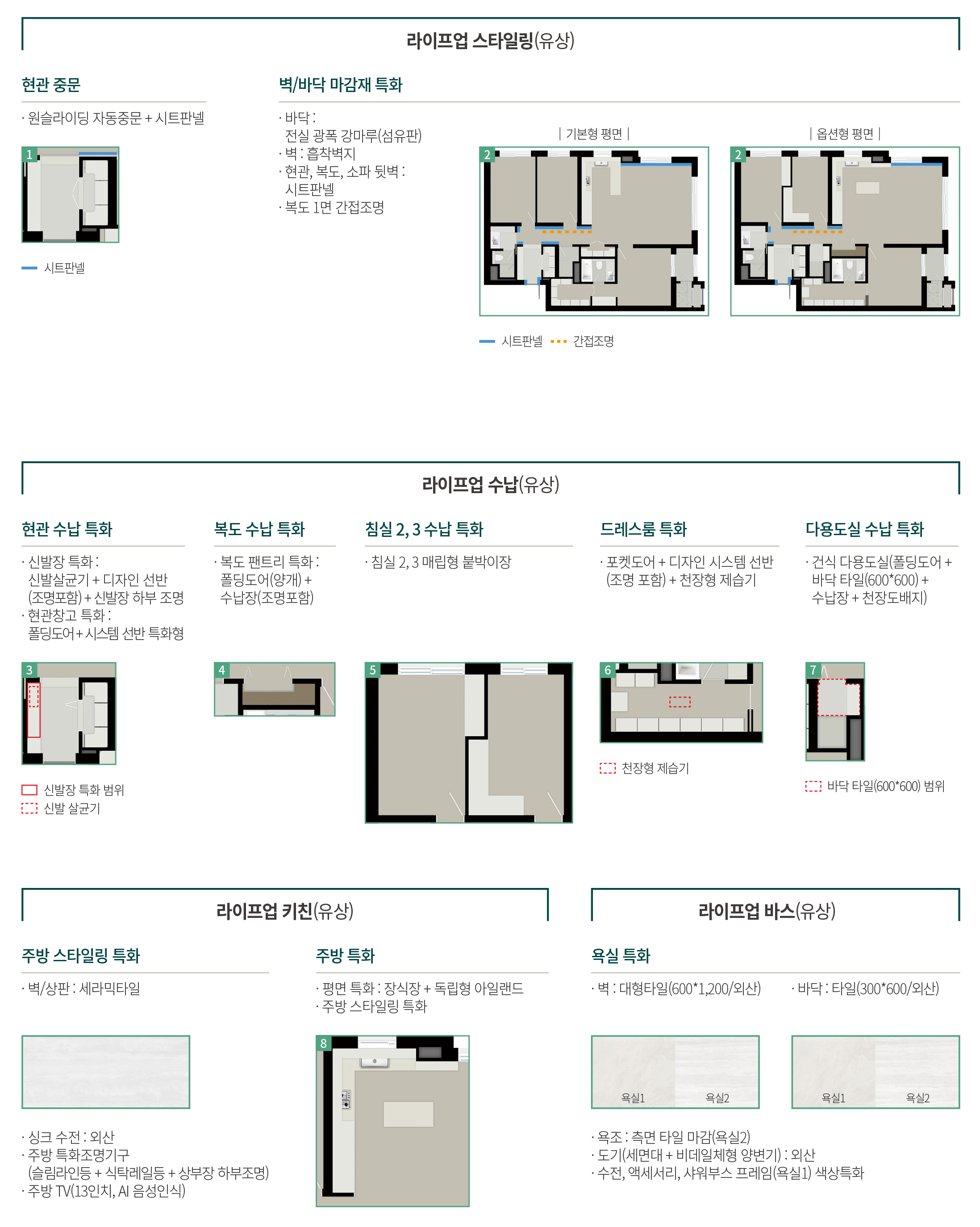 - 추가선택품목 및 옵션선택에 따라 배선기구, 스마트 스위치, 조명기구, 세대분전반, 온도조절기 및 스위치 등의 종류, 수량, 위치는 변경될 수 있습니다.