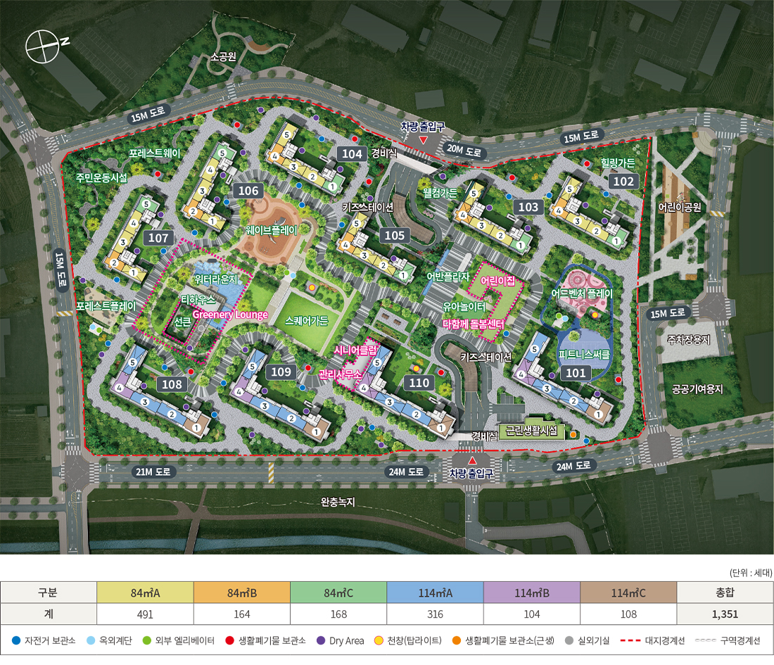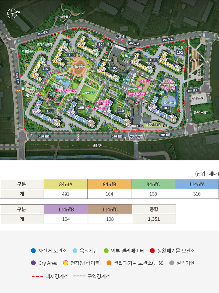 단지 내 조경 및 세부 식재계획, 시설물의 위치는 특화설계 진행 및 현장 상황에 의해 실제 시공이 변경될 예정입니다.