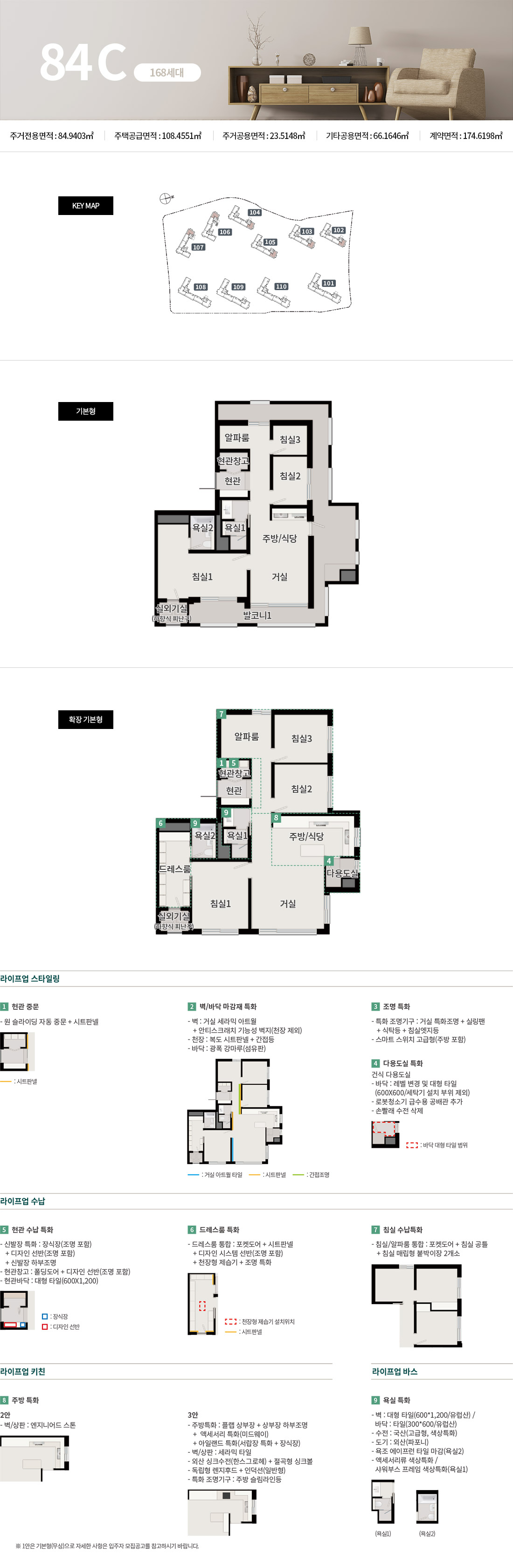 • 발코니 확장 및 옵션 선택에 따라 배선기구, 스마트 스위치, 조명기구, 세대분전반, 온도조절기 및 스위치 등의 종류, 수량, 위치는 변경될 수 있습니다.
