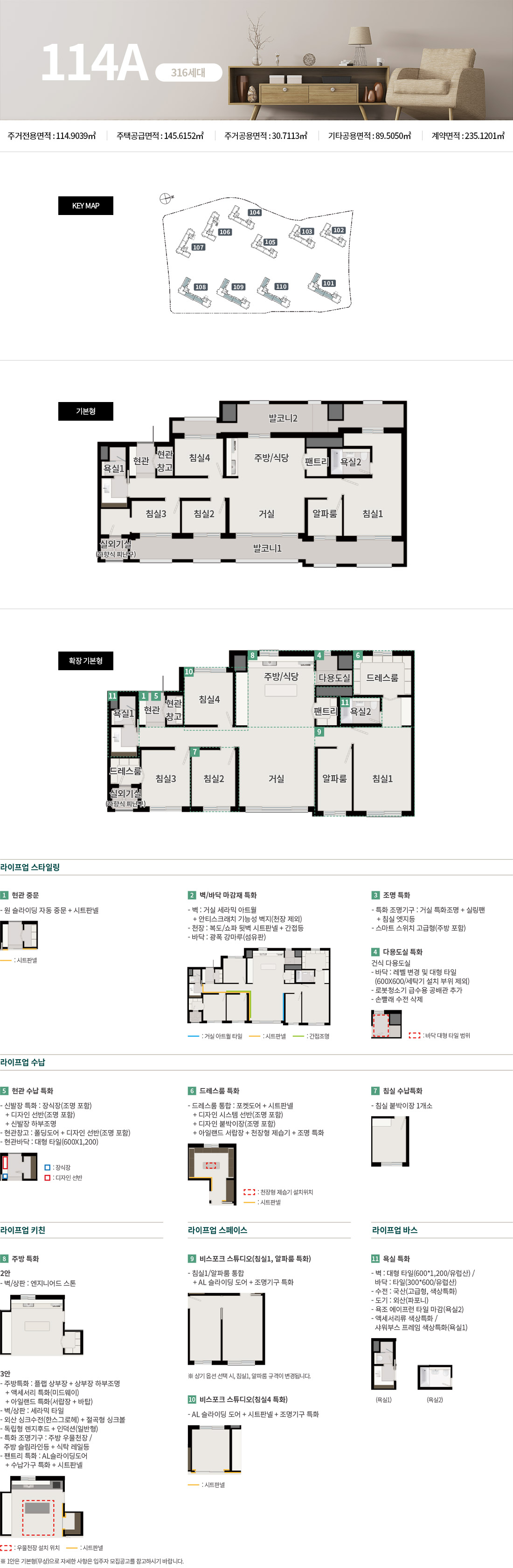- 발코니 확장 및 옵션 선택에 따라 배선기구, 스마트 스위치, 조명기구, 세대분전반, 온도조절기 및 스위치 등의 종류, 수량, 위치는 변경될 수 있습니다.