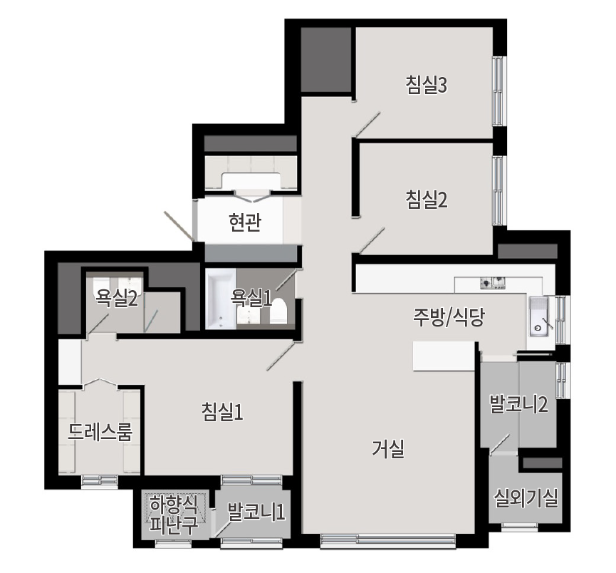 • 세대 내부 가구(붙박이 가구, 주방가구)설치 부위의 비노출면(바닥, 천장, 벽체)은 별도의 마감을 제공하지 않습니다.