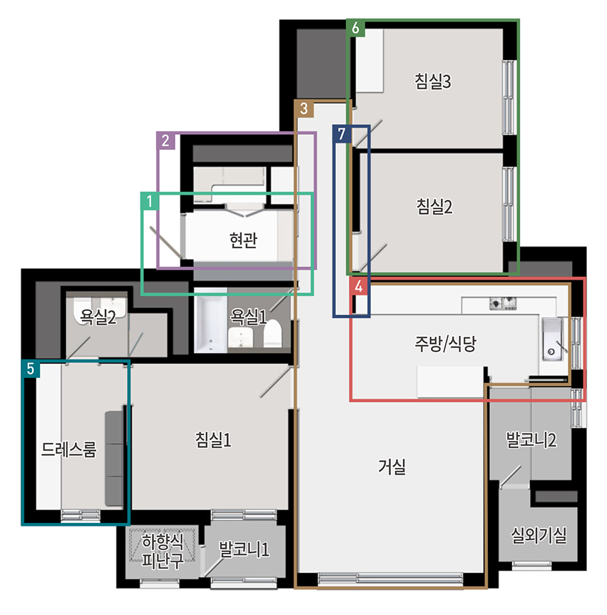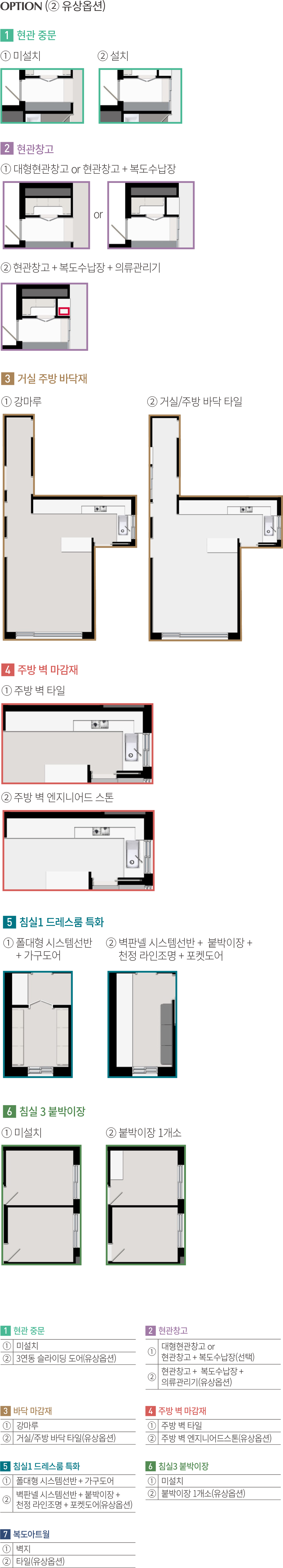 • 옵션선택에 따라 조명기구, 배선기구, 스마트스위치, 난방조절기, 분전반의 종류, 수량, 위치 등은 변경될 수 있습니다.