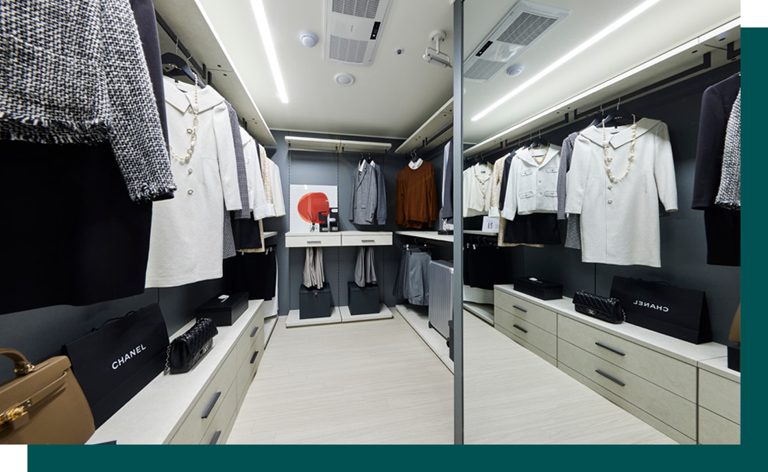 고급스러운 벽 판넬 마감과 넉넉한 시스템 선반이