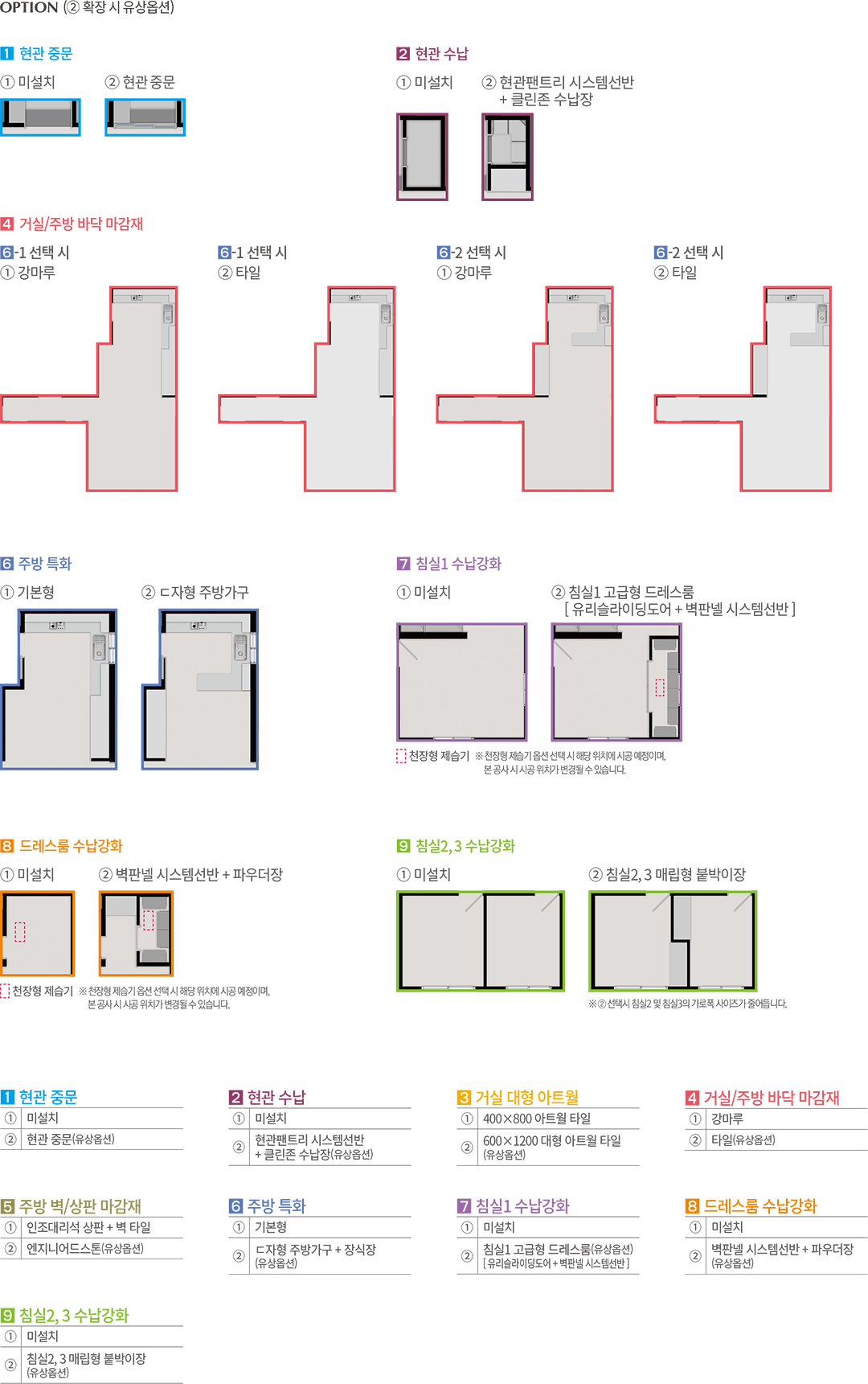 • 옵션 선택에 따라 배선기구, 스마트 스위치, 조명기구, 세대분전반, 온도조절기 및 스위치 등의 종류, 수량, 위치는 변경될 수 있습니다.