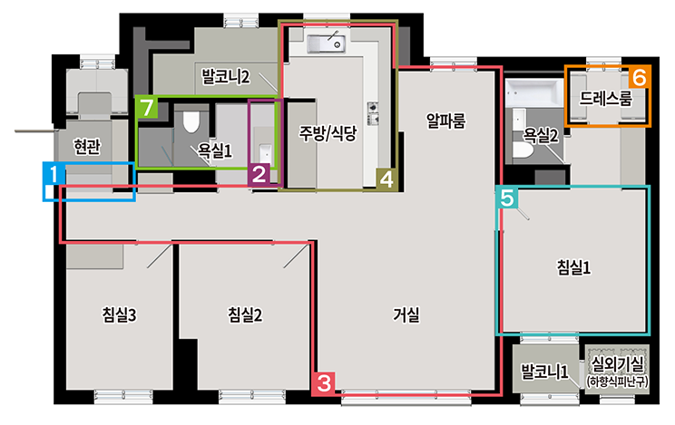 • 발코니 확장 및 옵션 선택에 따라 배선기구, 스마트 스위치, 조명기구, 세대분전반, 온도조절기 및 스위치 등의 종류, 수량, 위치는 변경될 수 있습니다.