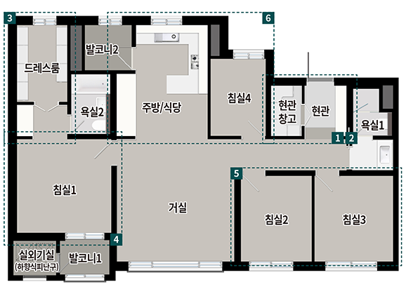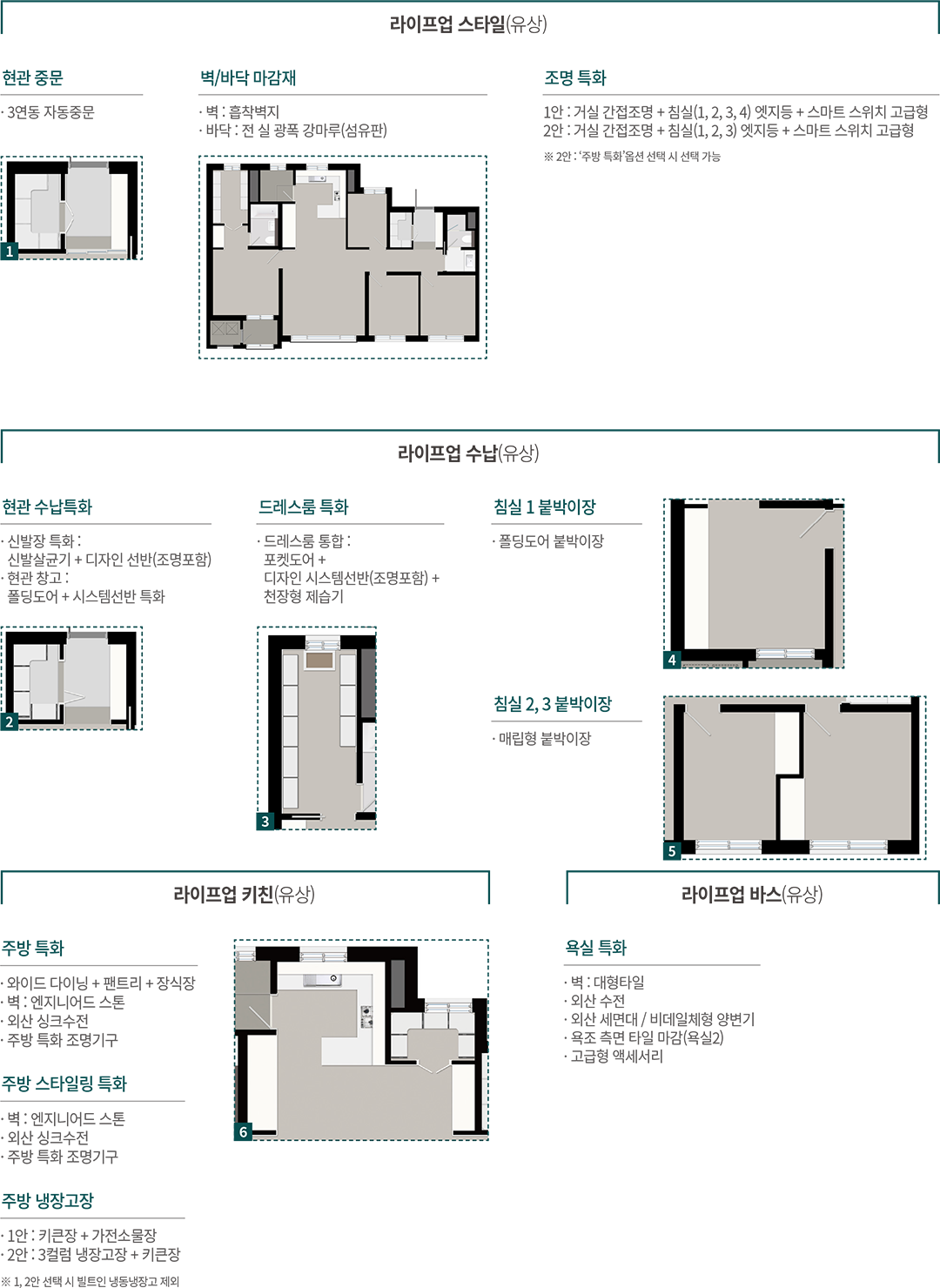 • 발코니 확장 및 옵션 선택에 따라 배선기구, 스마트 스위치, 조명기구, 세대분전반, 온도조절기 및 스위치 등의 종류, 수량, 위치는 변경될 수 있습니다.