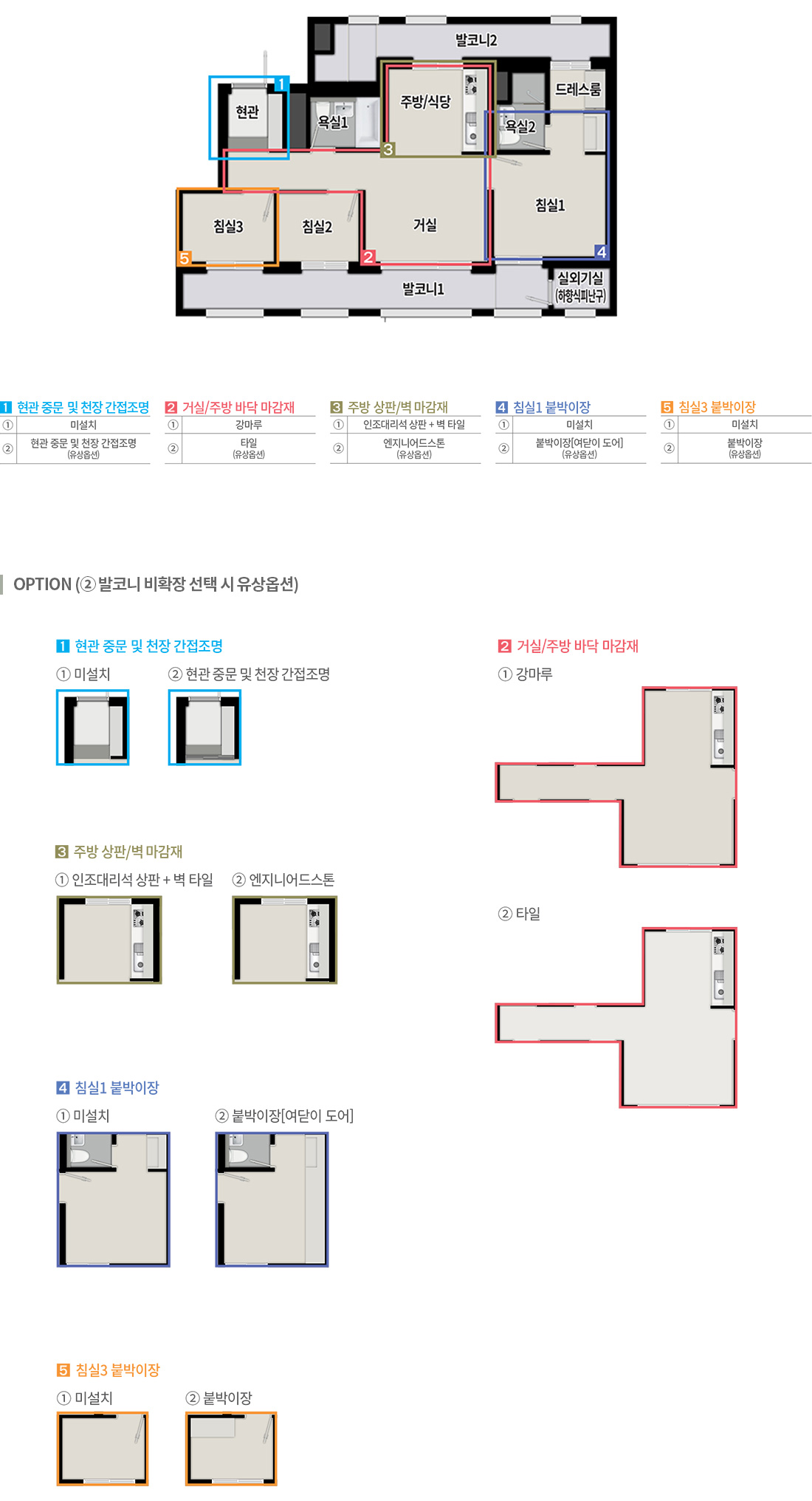 - 옵션 선택에 따라 배선기구, 스마트 스위치, 조명기구, 세대분전반, 온도조절기 및 스위치 등의 종류, 수량, 위치는 변경될 수 있습니다.
