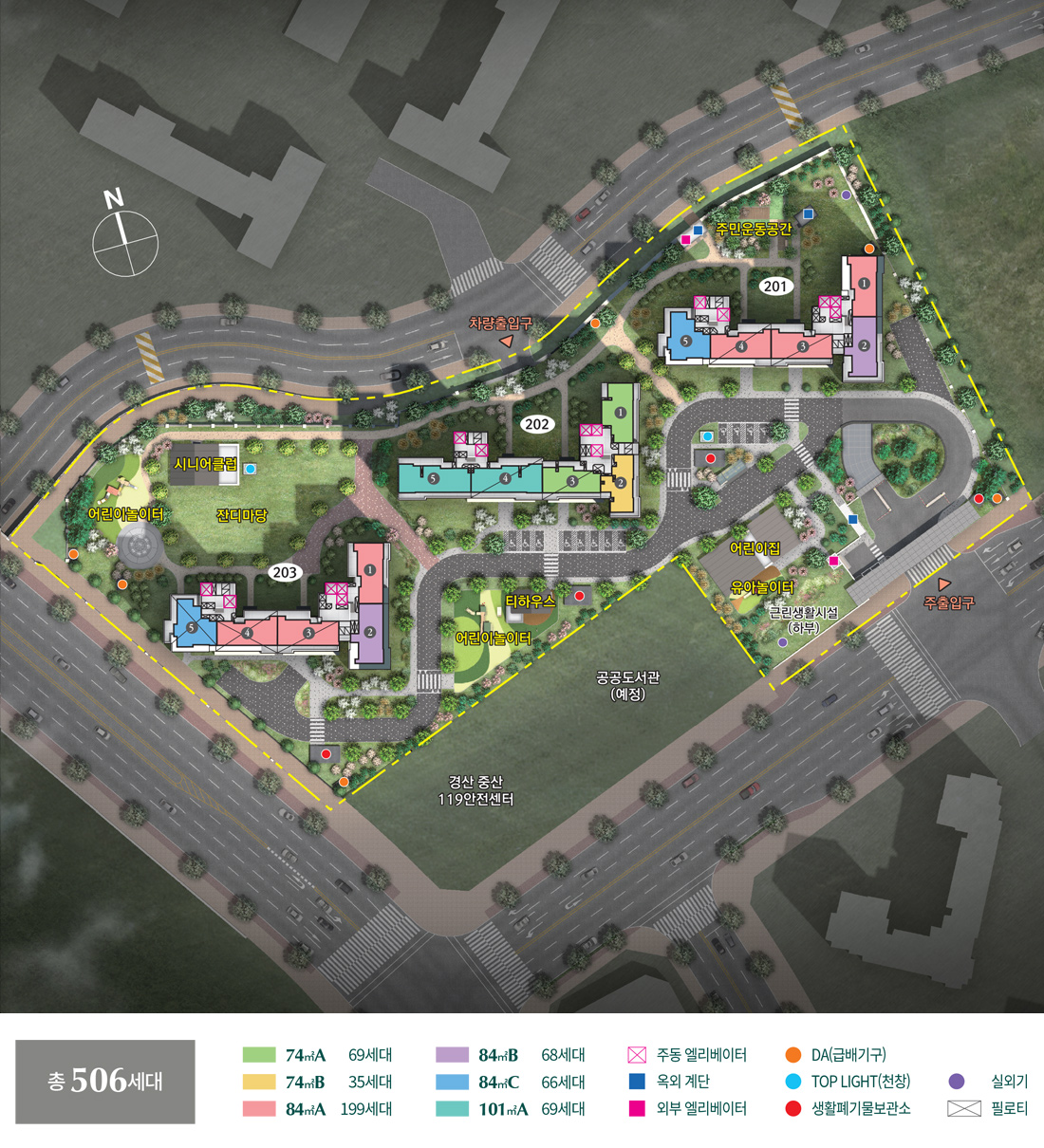 - 조경 식재, 조경시설물, 문주, 급배기시설(환기구 등), 생활폐기물보관소, DA, 탑라이트, 실외기 등의 위치 및 크기, 형태는 추후 변경될 수 있으며, 인접한 일부 세대는 조망, 일조의 일부 제한, 냄새 및 소음 등에