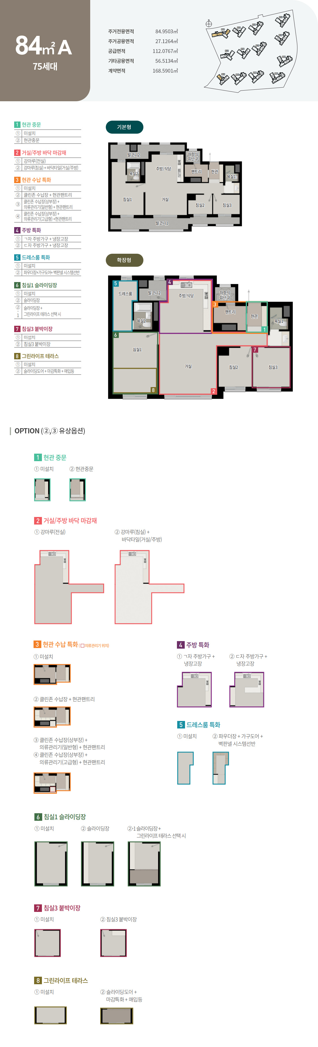 - 발코니 확장 및 옵션 선택에 따라 배선기구, 스마트스위치, 조명기구, 세대분전반 등의 종류 및 수량, 위치는 변경 될 수 있습니다.