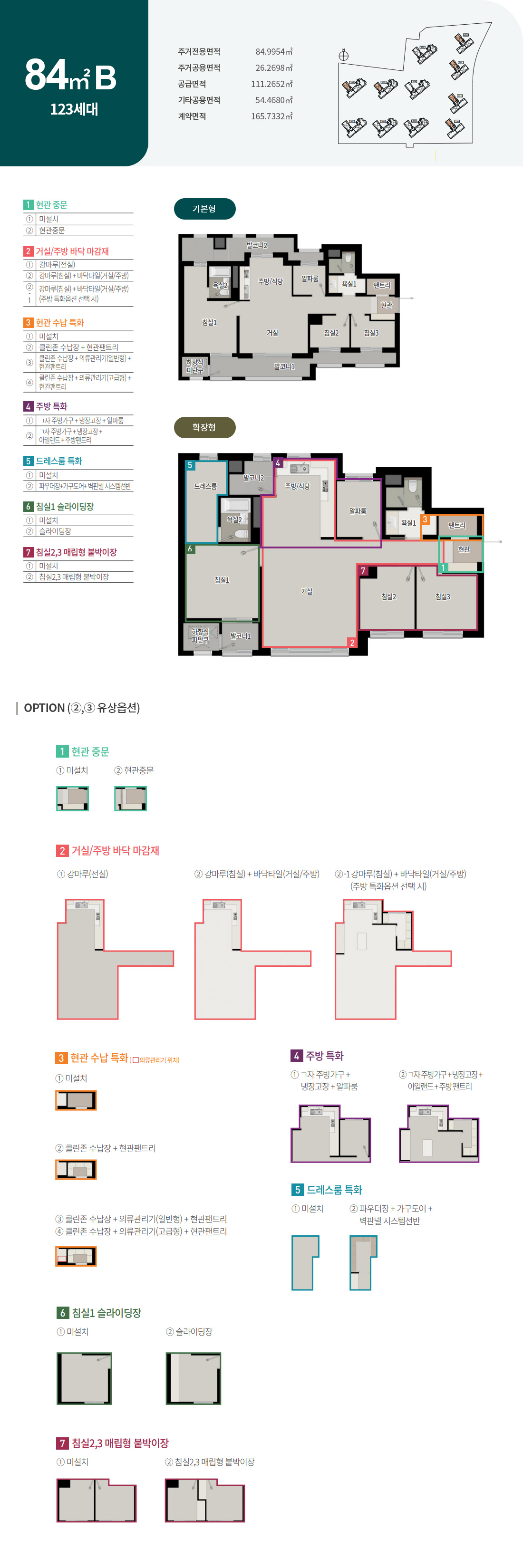 - 발코니 확장 및 옵션 선택에 따라 배선기구, 스마트스위치, 조명기구, 세대분전반 등의 종류 및 수량, 위치는 변경 될 수 있습니다.